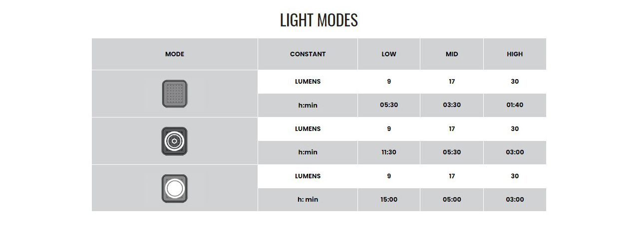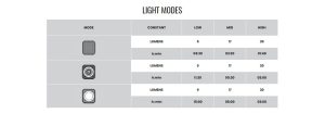 Modo constante y 2 patrones de flash, cada modo se puede ajustar a 3 niveles de brillo.