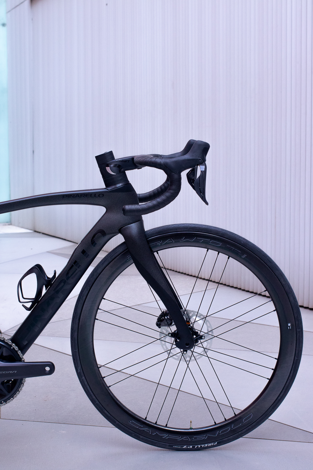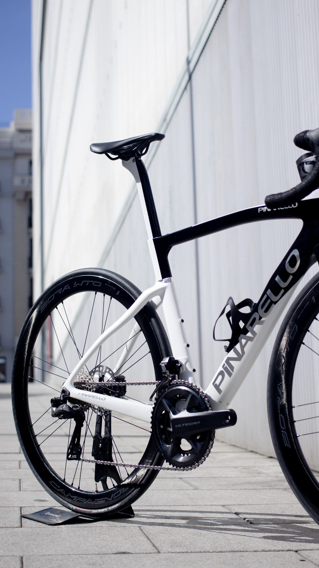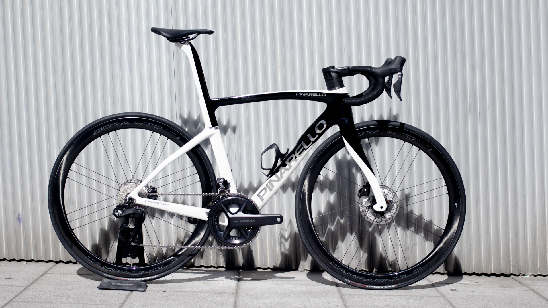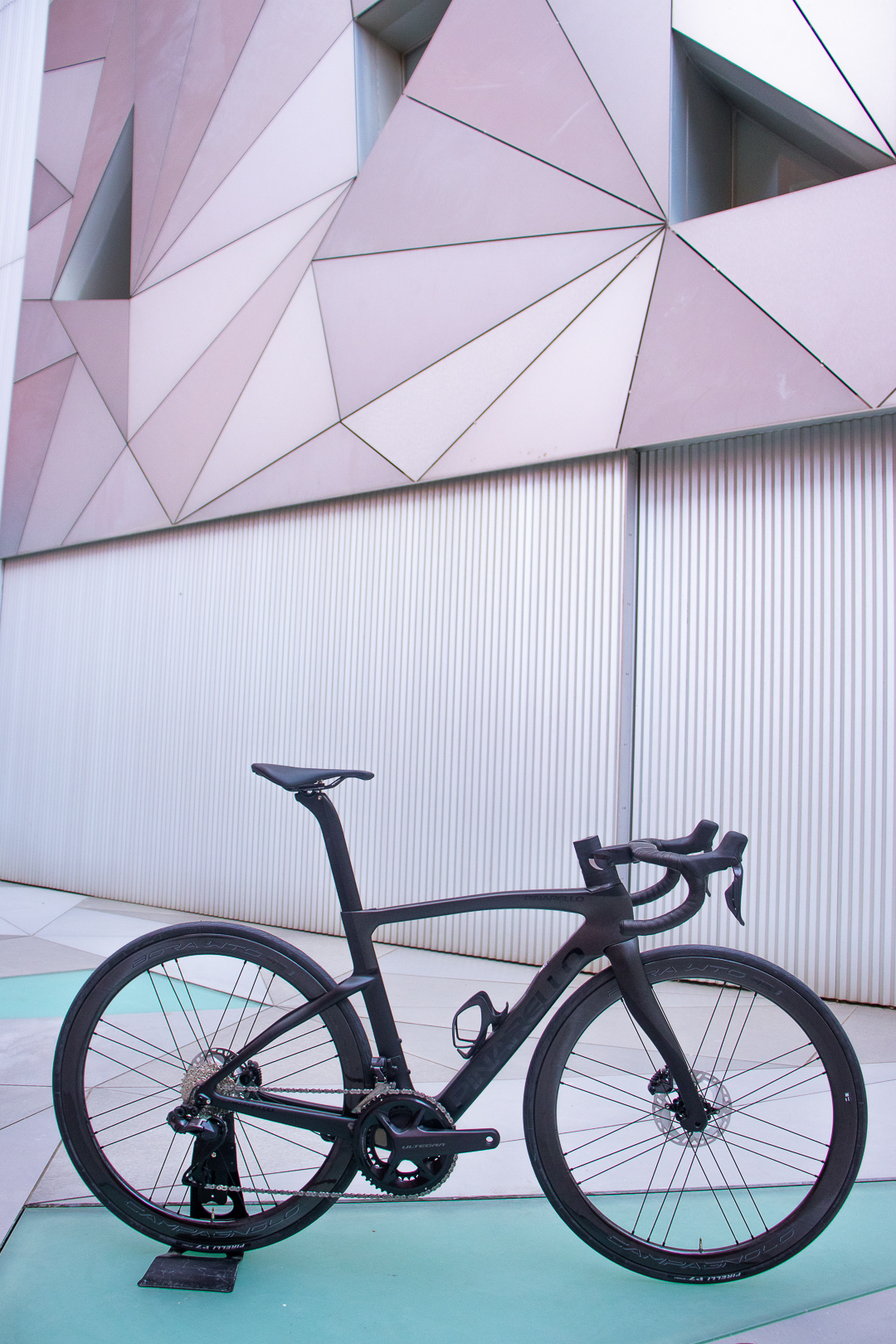 Bicicleta de la marca Italiana Pinarello con su modelo F, cuadro y horquilla de carbono, Grupo completo Shimano Ultegra DI2 12 velocidades y ruedas de carbono Campagnolo.