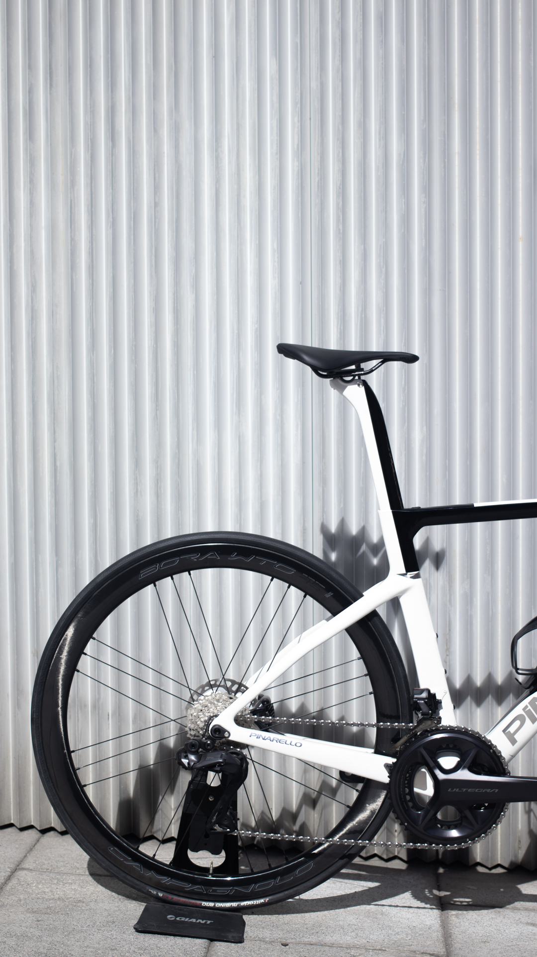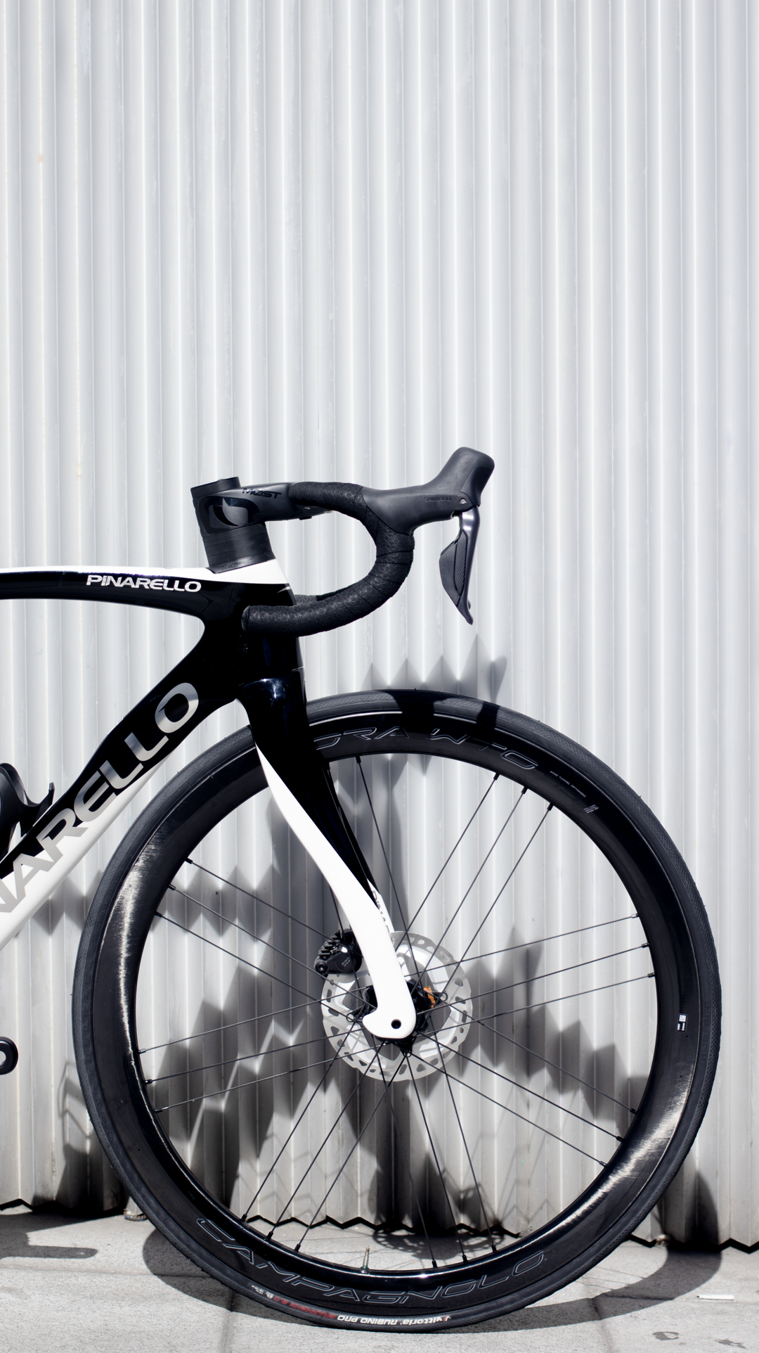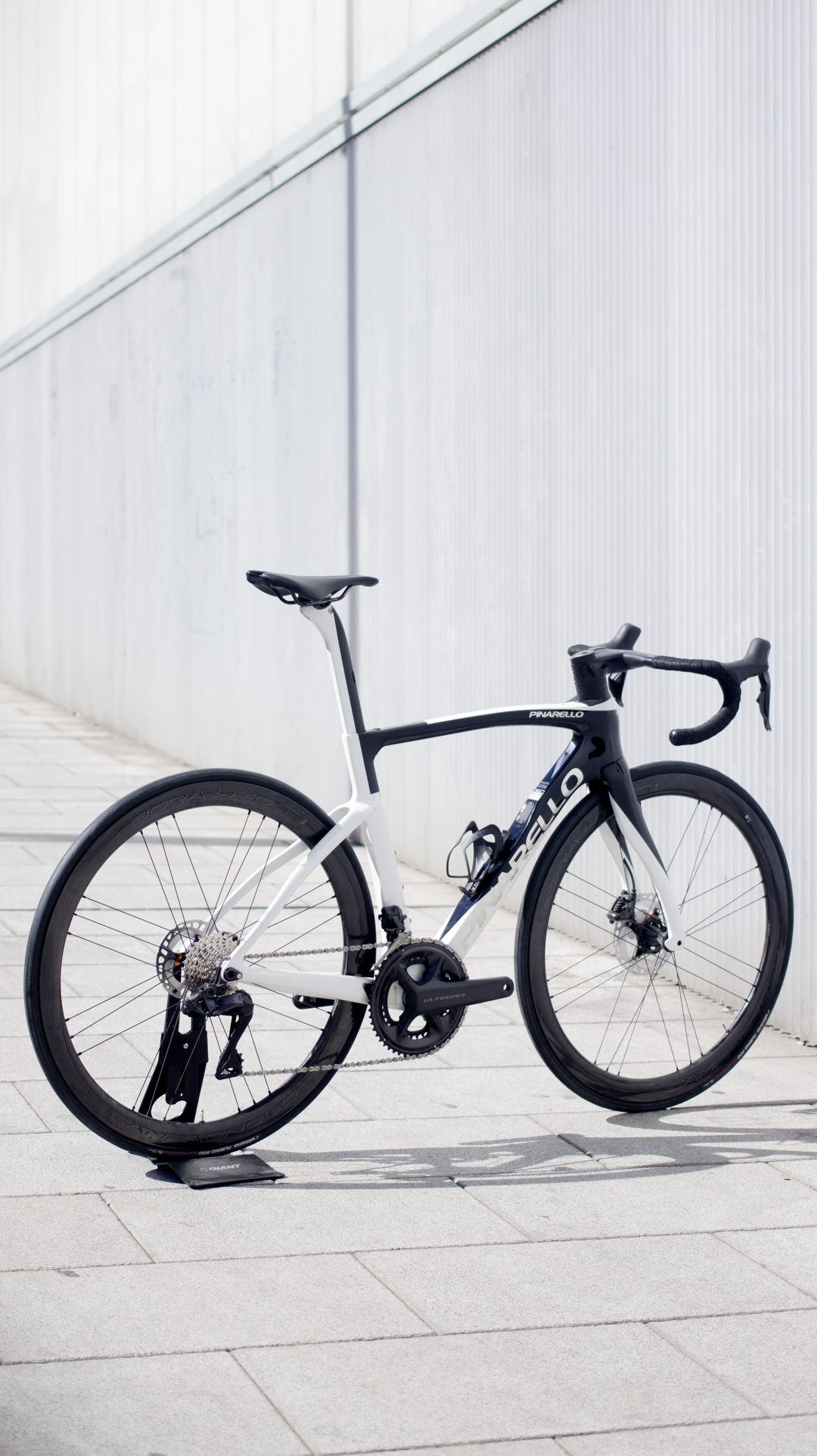 Bicicleta de la marca Italiana Pinarello con su modelo F, cuadro y horquilla de carbono, Grupo completo Shimano Ultegra DI2 12 velocidades y ruedas de carbono Campagnolo.