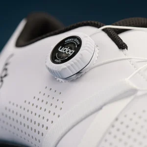 La suela de compuesto de carbono y nailon incluye un canal de ventilación direccional para el flujo de aire, almohadillas de goma integradas en el talón y la puntera para un mejor agarre, y una amplia plataforma metatarsiana para un enganche seguro de las calas. Las tuercas de las calas de aleación de titanio permiten un ajuste de 5 mm hacia atrás, lo que proporciona a los ciclistas un mayor control sobre su posición y eficiencia.